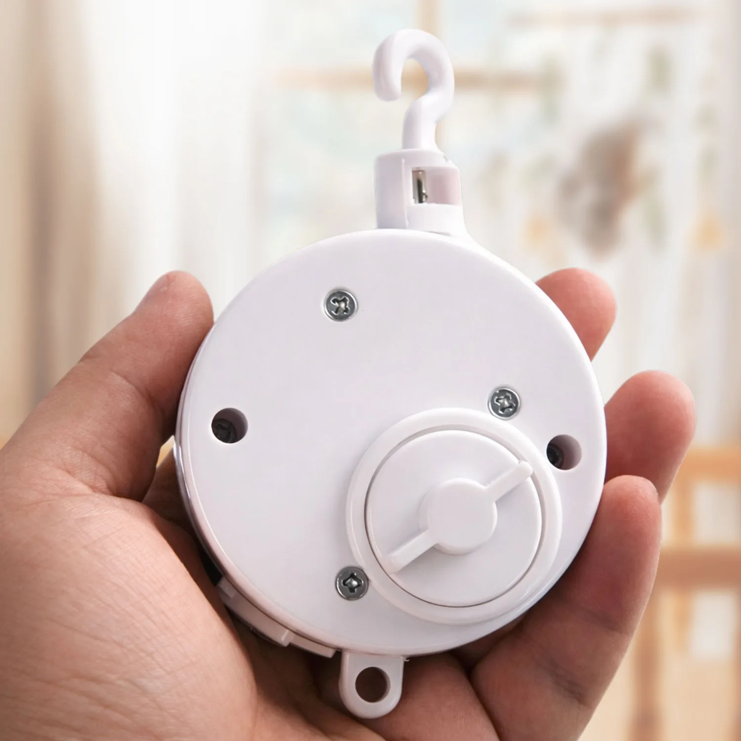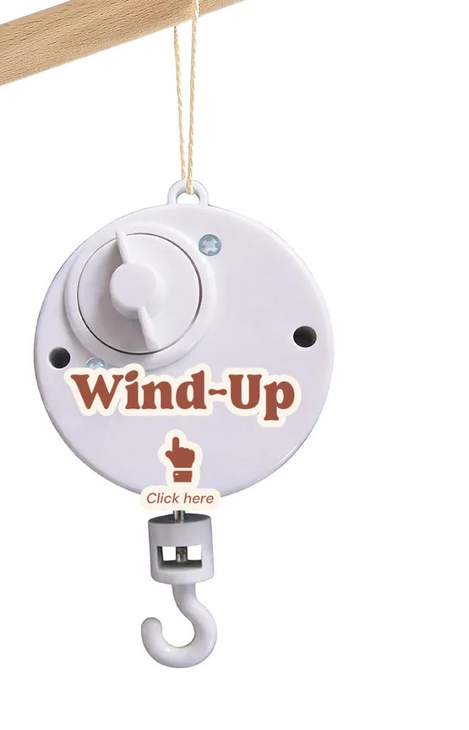 A simple old school wind up spinning music box to enhance the baby mobile.