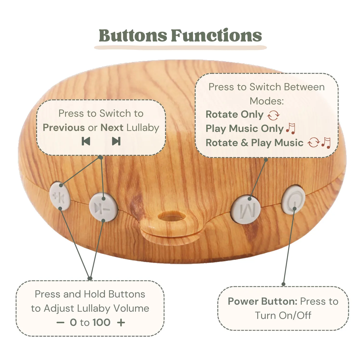 Rather than full-length songs, the music box plays short excerpts of classic lullabies and instrumental melodies, flowing from one tune to the next. This creates a soft variety of sound that can be enjoyed at very low volume for sleep, or slightly louder during awake times. Some parents enjoy using the rotation alone without the sound. The flexibility of the music box is perfect for customising to what works best for your child.